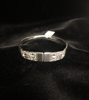 The Coil Hinge bracelets are handcrafted from 2 silverware handles. The cut ends are rounded then soldered into the coil to omit a clasp. Coil hinged bracelets are much easier to put on/ take off without a clasp.
